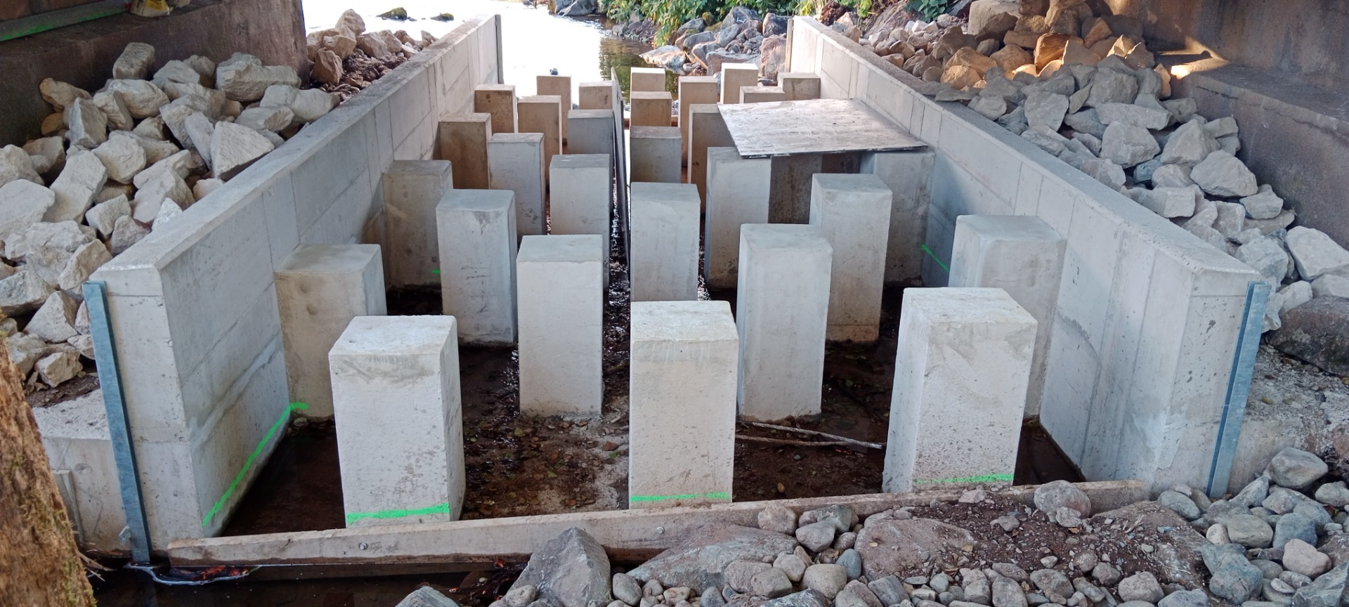 Grace à une météo clémente et le niveau d'eau faible de notre Rahin, les travaux se sont déroulés rapidement. A présent on peut voir la construction presque terminée avec ses plots verticaux derrière lesquels les poissons pourront se tenir à l'abris du courant et progresser dans la passe à poissons jusqu'au seuil amont et poursuivre leur chemin de migration vers leurs zones de fraye.